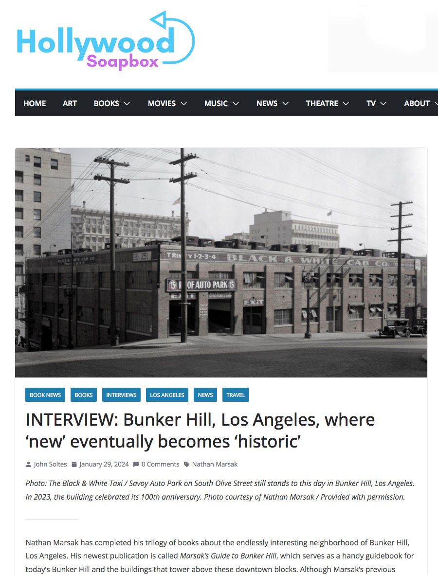John Soltes, Hollywood Soapbox, interviewed me recently about the extant structures on Bunker Hill, and my recent guidebook about them.